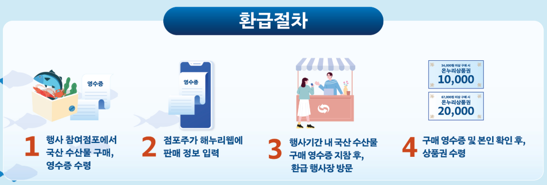행사 기간 내 참여 전통시장의 지정 점포에서 국내산 수산물을 구매한 뒤, 해당 시장에 마련된 환급창구에 영수증을 제출하면 됩니다. 신분확인 가능한 휴대폰 또는 신분증 또는 카드를 꼭 지참하셔야 환급이 가능합니다.