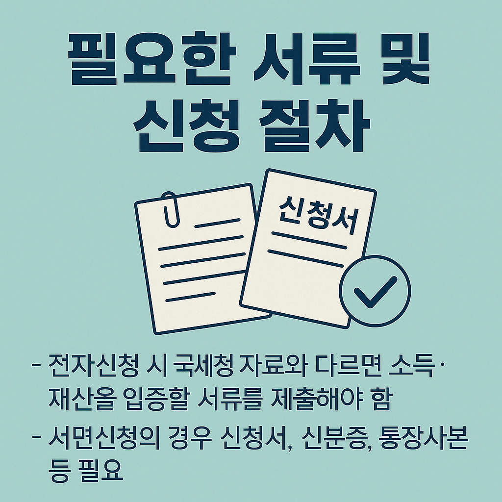 전자 신청 시 홈택스나 손택스를 통해 별도의 첨부 서류 없이도 신청이 가능합니다. 국세청이 보유한 근로소득 지급명세서, 사업소득 신고내역, 재산 자료 등을 활용해 심사가 이루어지기 때문입니다. 다만, 다음과 같은 경우에는 관련 서류 제출이 필요할 수 있습니다: